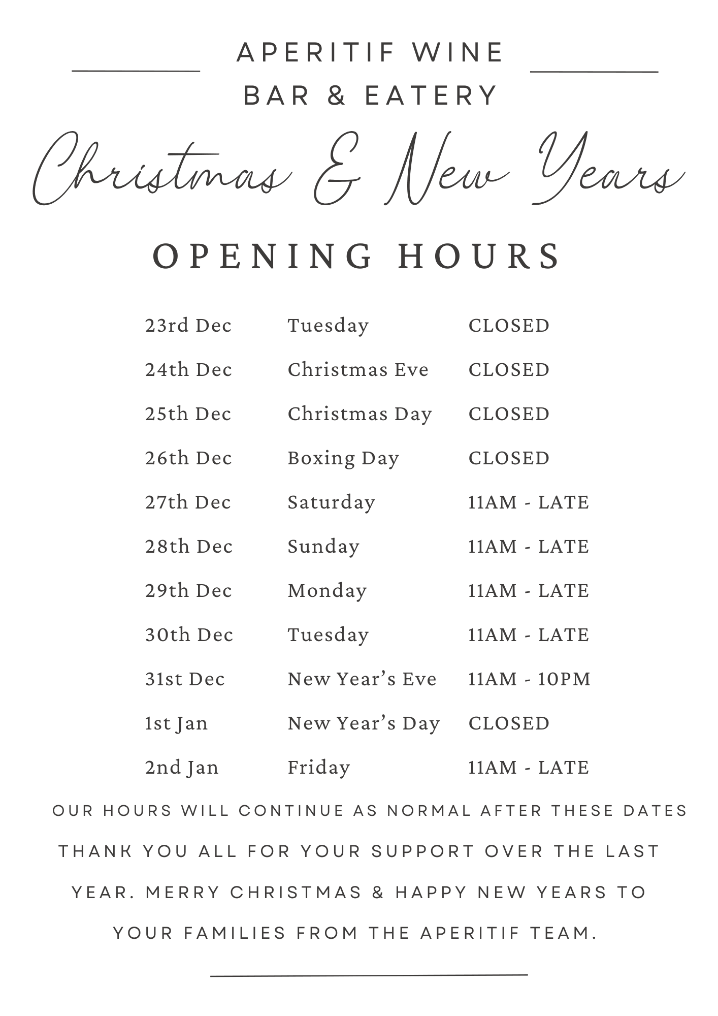 WINE BAR HOLIDAY HOURS